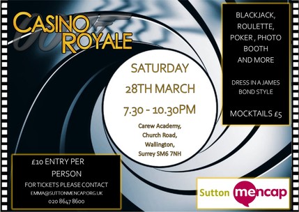 The event will take place on Saturday 28th March 7.30 - 10.30pm at Carew Academy, Church Road, Wallington, Surrey SM6 7NH. Tickets are £10. There will be blackjack, roulette, poker and more. Dress in a James Bond style and record your finery in our photo booth, enjoy a Mocktail from our bar and compete to be the one with the most chips at the end of the evening for our mystery prize... For tickets and more information please contact emma@suttonmencap.org.uk or call on 020 8647 8600. File attached